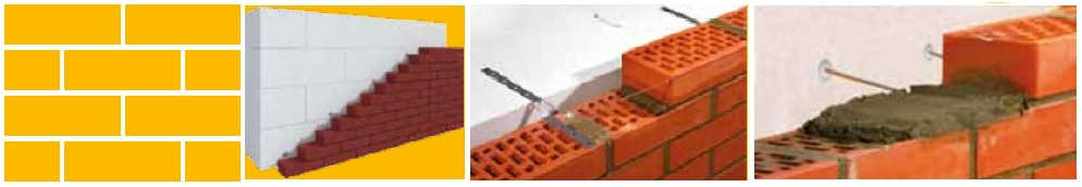 При облицовке кирпичом кладки из газобетонных блоков обязателен вентзазор 2-3 см (между блоком и кирпичем) и мероприятия по выводу конденсата. Облицовку можно возводить параллельно с возведением несущей стены, либо осуществлять облицовочные работы на готовой стене. Для соединения кладки из газобетона и кирпича используются гибкие связи, которые закладываются в швы или монтируются в стену газобетона. Данный вариант облицовки позволяет отказаться от дополнительного утепления.