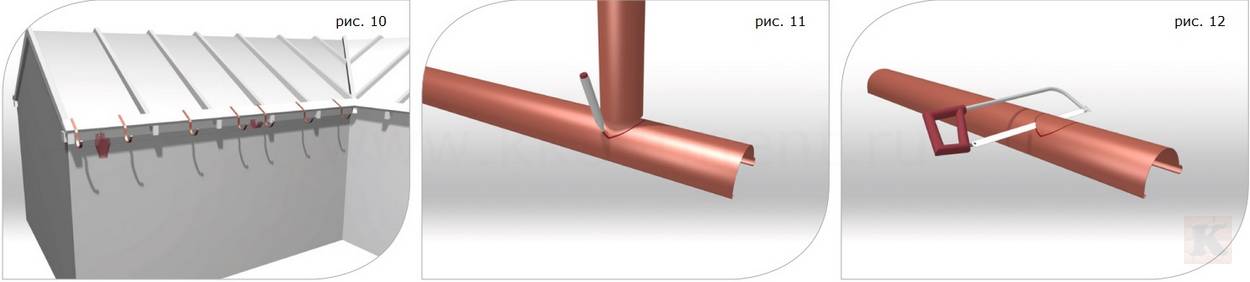 а) Определяем точку установки воронки (ссылка). Здесь следует придерживаться правила - это самое низкое место на всей длине жёлоба (ссылка) (см. рис. 6).б) Прикрепите по одному крюку с обеих сторон (см. рис.10).