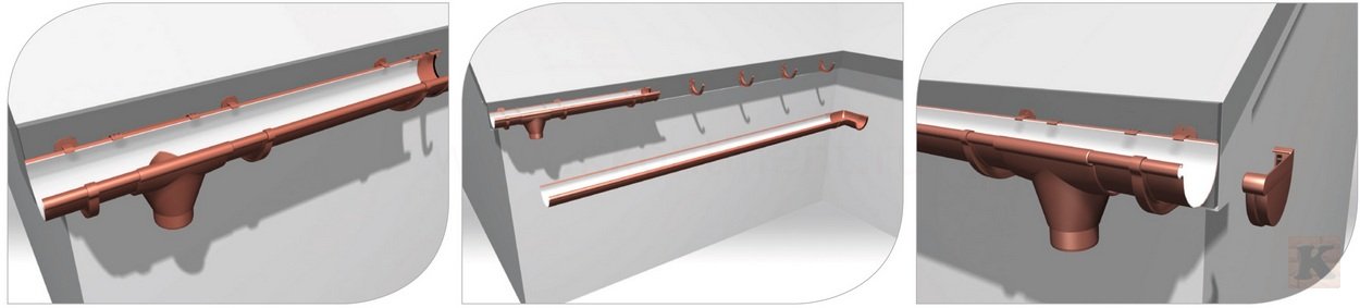 д) Аккуратно установите желоба на закрепленные кронштейны, вставляя в задний, а затем передний отворот крюков (рис. 15, 16).
