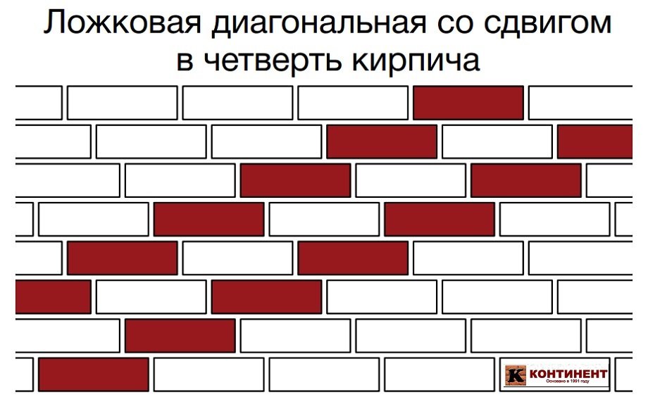 4. Ложковая кладка диагональная со сдвигом в четверть кирпича. При укладке ложковой стороной кирпич в каждом ряду сдвигается на четверть.