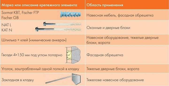 Ячеистый бетон — пористый материал с невысокой прочностью при растяжении. Поэтому использование его в качестве основы для крепления навесного оборудования необходимо использовать специальные крепежные элементы, виды и назначение которых приведено в таблице ниже: