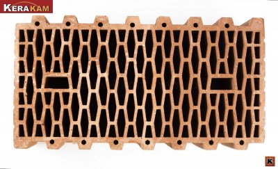 Крупноформатный керамический блок КЕРАКАМ 51 позволяет возводить стены домов толщиной 51 см без использования дополнительного утепления, при этом он прекрасно подготовлен для нанесения внутренних и фасадных штукатурок или облицовку керамическим, клинкерным или ручной формовки кирпичами. При толщине стены всего в 51 см из керамического блока, достигается такая теплопроводность, которая при использование обычного керамического кирпича, может быть достигнута только при толщине стены 120-200 см. Имея небольшой вес, керамический блок позволяет при строительстве домов использовать упрощенную конструкцию фундамента, что дает возможность экономить средства. Это достигается благодаря рациональному расположению пустот керамического блока и пористой структуре материала.