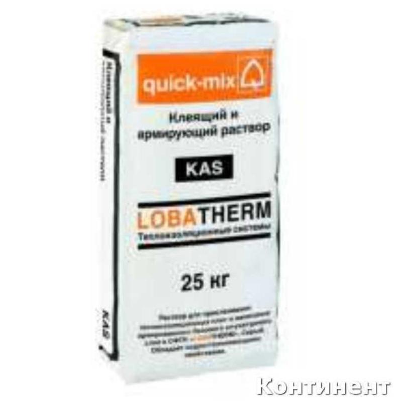 Армирующая и клеевая шпаклевка Квик-микс KAS "Зимний" 72619. Применяется для приклеивания изоляционных плит из полистирола и минеральной ваты в СФТК «LOBATHERM», а так же в качестве базового штукатурного состава (мин.толщина 4 мм) для нанесения на ровные изоляционные плиты с последующим оштукатуриванием тонким слоем.