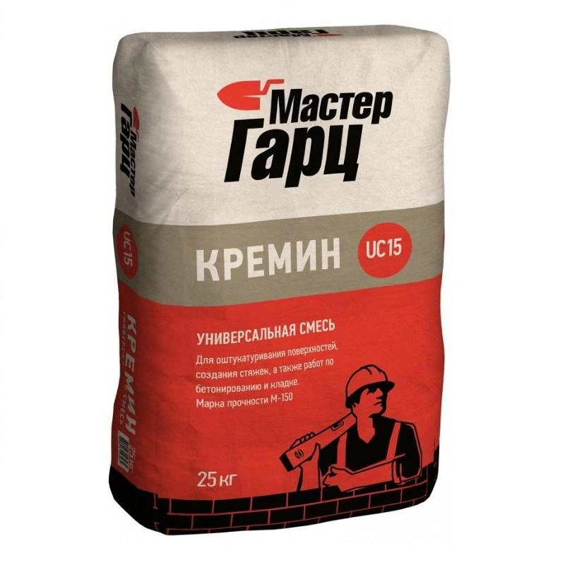 Смесь универсальная М-150 "Кремин" 25 кг. Предназначена для кладки строительного (рядового) кирпича и блоков, газосиликатных и бетонных блоков, бетонирования лестниц, ремонта и заделки бетонных стен, укладке тротуарной плитки, штукатурных работ, обработки швов при монтаже железо-бетонных изделий.