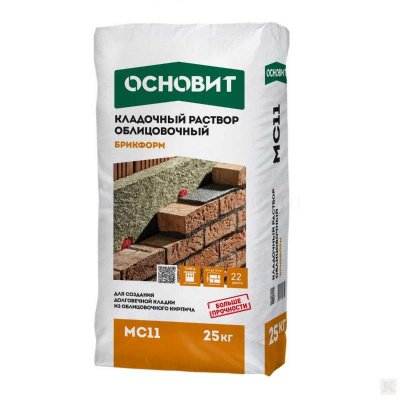 Цветная кладочная смесь Основит БРИКФОРМ МС11 оранжевого 044 цвета. Предназначена для кладки облицовочных кирпичей - керамического, клинкерного и силикатного. Серый кладочный раствор Основит способствует прочному сцеплению кирпичей и заполнению шва по всей поверхности. Cостав раствора предотвращает появление высолов и белых подтёков, а пластичность раствора обеспечивает простоту выполнения работ.